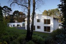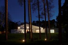 The house is set on the slopes of an old English estate called St George’s Hill on the outskirts of London. Surrounded by lush landscape of golf courses with great mature trees and rolling hills, the plan engages itself with the landscape seamlessly. The house is set at a mid point on its site, which slopes down towards a small stream along the road edge. The natural water flow arising from the top of the site is collected in reflecting pools and allowed to pass below the house naturally to find its final course at the stream after it passes below Scotts Pines planted over a century ago.