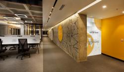 A primary corridor that starts from the entrance space has been designed as a backbone of the whole office space with a continuous surface on one side, while on the other side is confined by the reception area and open office spaces. The main wall that defines the corridor is treated as a surface that incorporates and projects the physical and conceptual identity of the space. The existing concrete surface has been preserved and graphics designed by AVCI ARCHITECTS have been applied on it. The suspended ceiling over the corridor has been designed to contain the backbone of the (mechanical) electrical system.