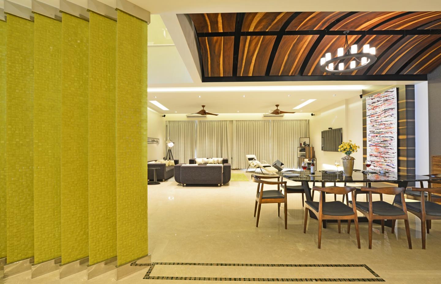 The accentuating facet of this space, is a false ceiling pattern above the dining that is