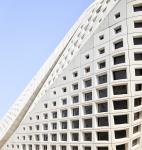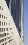 At the interface between tower and podium, the glass facade gradually transforms into a grid of rhomboid fibre-concrete panels, giving the large surfaces of podium and conference centre a solid and sculptural appearance; underlining the dynamic character of the form and providing daylight to the building’s interior.