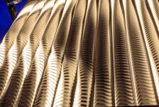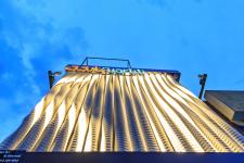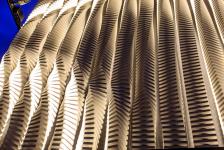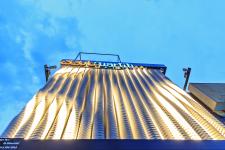 In the first stages of design, metal axles were arranged in equal distances so that the design elements (irregular pentagons made with teflon) could be placed with free regular movements in these vertical axles. Not being as sharp as triangles and as soft as circles, irregular pentagons were the best shapes for forming the wavy appearance of the façade. Rectangular faces of these pentagons and using the warm colors for the façade lighting makes the design elements look like Persian bricks. In the end, the harmonic lighting and numerous wavy shapes which is achieved with rotation of the design elements, forms the light lines which fade through each other with chaotic orders and shows wavy lines of light and shadow to the spectators.
