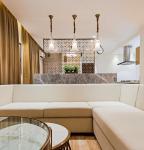 As you enter the apartment, a lobby leads to the living and dining area, segregating the entrance from the other areas and maintaining privacy at the same time. The living and dining area has a neutral palette, accented with geometric patterns and royale colours such as gold, blue and lead. The living and dining areas are divided by a creative golden mesh partition, standing as a masterpiece of the space. The exquisite bar stools, marble top dining table, and designer lighting fixtures add oomph to the place.