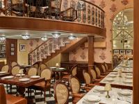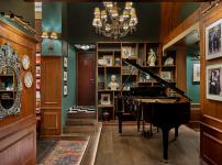 staircase leads the journey to the intimate mezzanine dining. Flushed with an ornate gypsum ceiling and a classic chandelier, this precinct has its innate sense of elegance tipped off with flamboyance. Subsequent to this arena, on the ground floor, the space on the left has been formulated into an exquisite alley with similar seating options and a marble mosaic flooring. This relatively slender sector guides the way to a distinctly divergent region adorned with an antique piano and a contemporary mantlepiece. Dipped in a shade of sea-green, the arena also houses luxurious booth seating with the intricacy of a beveled mirror in the milieu. Opulence with a requisite bookshelf area is a fresh idea hot from the oven, that defines and complements the other facets of the conceived décor. The black and white checkered marble flooring along with other significant minute pieces,