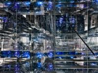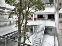 This renovation of a neglected building develops on three levels, with a large central atrium. The glass skylight on top of the atrium allows the three levels to be bathed in natural light in what otherwise used to be a poorly lit interior space. Additionally, the white interiors and white gradient film on the glass panels around the atrium add to the overall effect of the space.