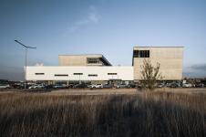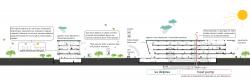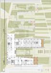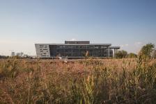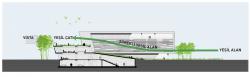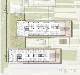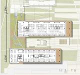 The low block incorporating the social functions connects the main masses. It stretches along the north-south direction and emphasizes the continuity of the neighbouring boulevard. This building, which is closed in the west direction is dissolved to the east and becomes a flexible social area that organizes internal and external circulation. It offers a hill overlooking the south while allowing the landscape to penetrate the basement in the north. The social block serves as a filter for users, employers and guests to navigate within the blocks while providing common space for the employees of four different companies. The roof of the social block is designed as a green roof as a continuation of the recreational area in the east. It also helps to sustain the climatic balance, reduce the wastewater, increase the thermal insulation and create a new recreational area.