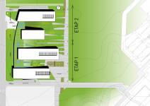 An integrated structure that reflects the corporate identities of four independent companies to be constructed in two stages is designed for the design proposal. The four prismatic blocks are positioned in the west/east direction, and the whole complex is aligned in the north/south direction to be integrated with the recreational area on the east and thus METU landscape is utilized to separate and integrate the buildings simultaneously. The two blocks on the south side are constructed at the first stage.