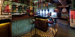 The arena in front of the bar is occupied by a long wooden community table, topped with consequent rows of green beer bottles. This sustainable approach utilizing a residual element for aesthetic embellishment is arranged in a rusted metal frame hung from the ceiling. The multipurpose table can be used by patrons of divergent configurations, owing to its transverse spans differentiated in two levels, with the row of chairs on one side and bar seating on the other to counter the disparity.