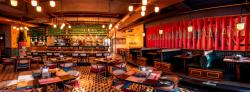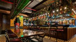 The centrally located bar, serving as the focal facet, may be deemed as a masterpiece in itself and has been further enhanced by the use of supplementary installations including a strip of trumpets above. The trumpets have light bulbs installed in their bells as an introduction of an innovative lighting addition. With colorful flags hung below them, these make for an eye-catching inclusion to an equally decorated bar.