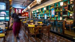 The colour blue has been predominantly used for décor, with accents of burgundy that enriches the spatial texture. Pop colours shades of yellow and pink have been used extensively for the graphics and slogans. The walls are highlighted by a carefully orchestrated collage of handmade green tiles and exposed brick. Yellow also features repeatedly, in the flooring tiles and furniture. The commuting flow is differentiated into virtual zones, identified by varying flooring patterns. Yellow and black patterned tiles demarcate the seating zones while black pandoro flooring emphasizes on the circulation. The porch at the front has a pandomo flooring along with an assortment of exposed brick and patterned tiles. The entire place maintains harmony dimmed yellow lights for a relaxed and a calm acquaintance. Rustic lights hang from an exposed ceiling, creating a subtle combination of premium and raw. The vibrant graffiti and eye-catching installations amplify the spirited vibe and the energetic interactions of the users.
