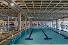 In the east and central volume (completed) are the covered and heated pools, visually integrated to the outdoor water park. At the same level, there are the squash courts, snack bar, locker rooms and administration. On the upper floor is the event hall, technical support area and terrace. On the lower deck are the boat and storage facilities.