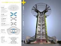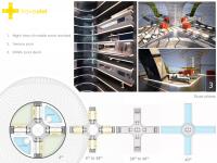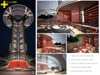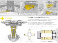 Zoning: The ground floor has public functions such as the reception, lobby, coffee shop, public toilets and a multi cuisine restaurant. This is enveloped by a glass canopy. It also serves as a parking for the traveollers and a transfer zone for the room. The third floor is a spa and open deck area with two swimming pools. This serves as a transition zone for the public to the private areas. The mobile room docking station continues from the 5th floor to the 30th floor. A typical floor plate consists of 8 mobile room parking bays and 4 lifts along with fire exit staircases.The last three floors are again public areas housing facilities such as business centers, night clubs and banquet halls.The roof top is a deck and the four arms of the building turn into infinity pools. This level would have apanoramic view of the city skyline. A huge metal canopy envelopes the roof top with thin film solar panels which is the power source for all the mobile room units.