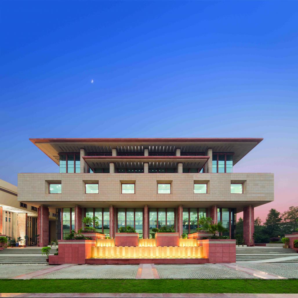 The principles of green building design have been employed with a tilt towards passive techniques that require the basic design starting from the envelope and massing to be correct. The outer envelope is like a mushroom at the lower three floors with the second floor providing out 6m on all sides of the second floor and effectively shading the floors below. Upper 2 floors have 4 to 6m Cantilever pergolas which form the key visual elements that break the harsh Delhi Sunlight and create a cooler shaded microclimate around the outer envelope. This allowed the architects the option of using hermetically sealed double glazed windows all around to enable the users to enjoy the surrounding tree line without either adding to the heat gain or the uncomfortable glare that the absence of a secondary transitory volume around the building creates.