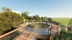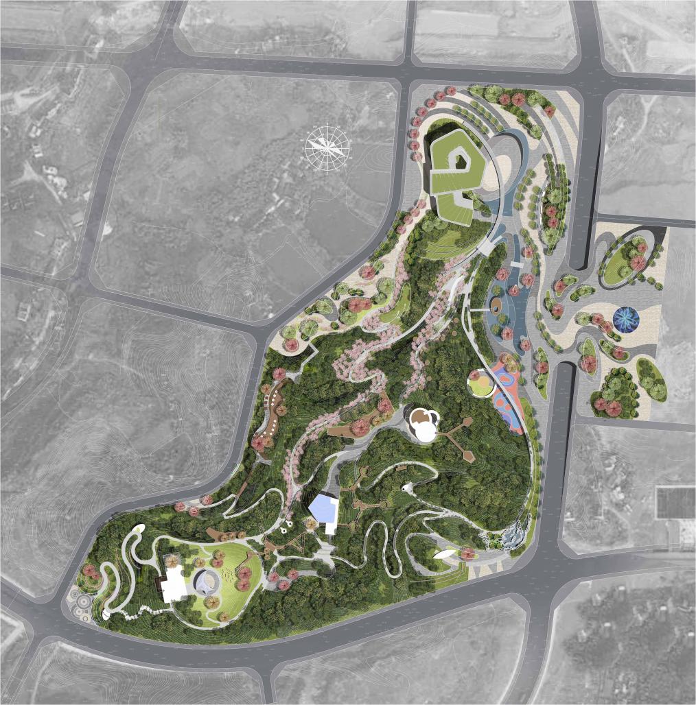 The location plan divides the peak park into two parts, namely the city square and the mountain park. The city square is partially equipped with a large service building to provide comprehensive services for the entire Nanhu West District. This design will be used as a “big bonsai” in the downtown area of the prosperous city. It expresses the artistic beauty while highlighting the urban cultural quality and reinterpreting the way of mountains, water and city with a refined attitude. The use of hillside flowering, overhead plank roads, aerial platforms and other design techniques to resolve the constraints of mountain terrain height differences, thus creating the mountain space into a fun, landscape, participatory activity space, has become the most attractive "mountain park".