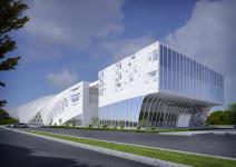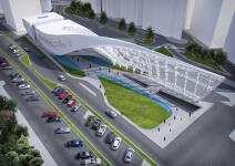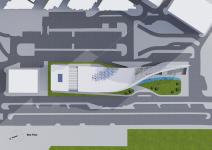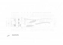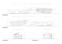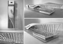 The concept behind the project was to design an undulating architectural envelope. The structure is twisted in a way that transitions from a solid white volume to a light perforated surface. The surface provides space underneath for a shaded public plaza.