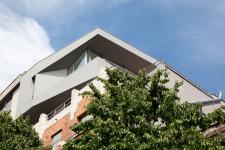 The project involves raising an existing building in the centre of the city, between 2 very different-sized buildings. The aim is to create a more harmonious size transition through a three-dimensional interplay of continuous facets, like a cut stone perceived as a jewel set on the roof of the building. The full sections are composed of metal-plated panels which play with the light as a function of the orientation of the facet. A colour difference is achieved between the main unfolding outside and the inclined facets inside, thus accentuating the box-like effect of this apartment. The common living spaces were placed on the 6th floor to take advantage of the better sun exposure and view, while the 3 bedrooms are located below, lending them more privacy and protection.