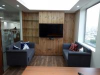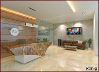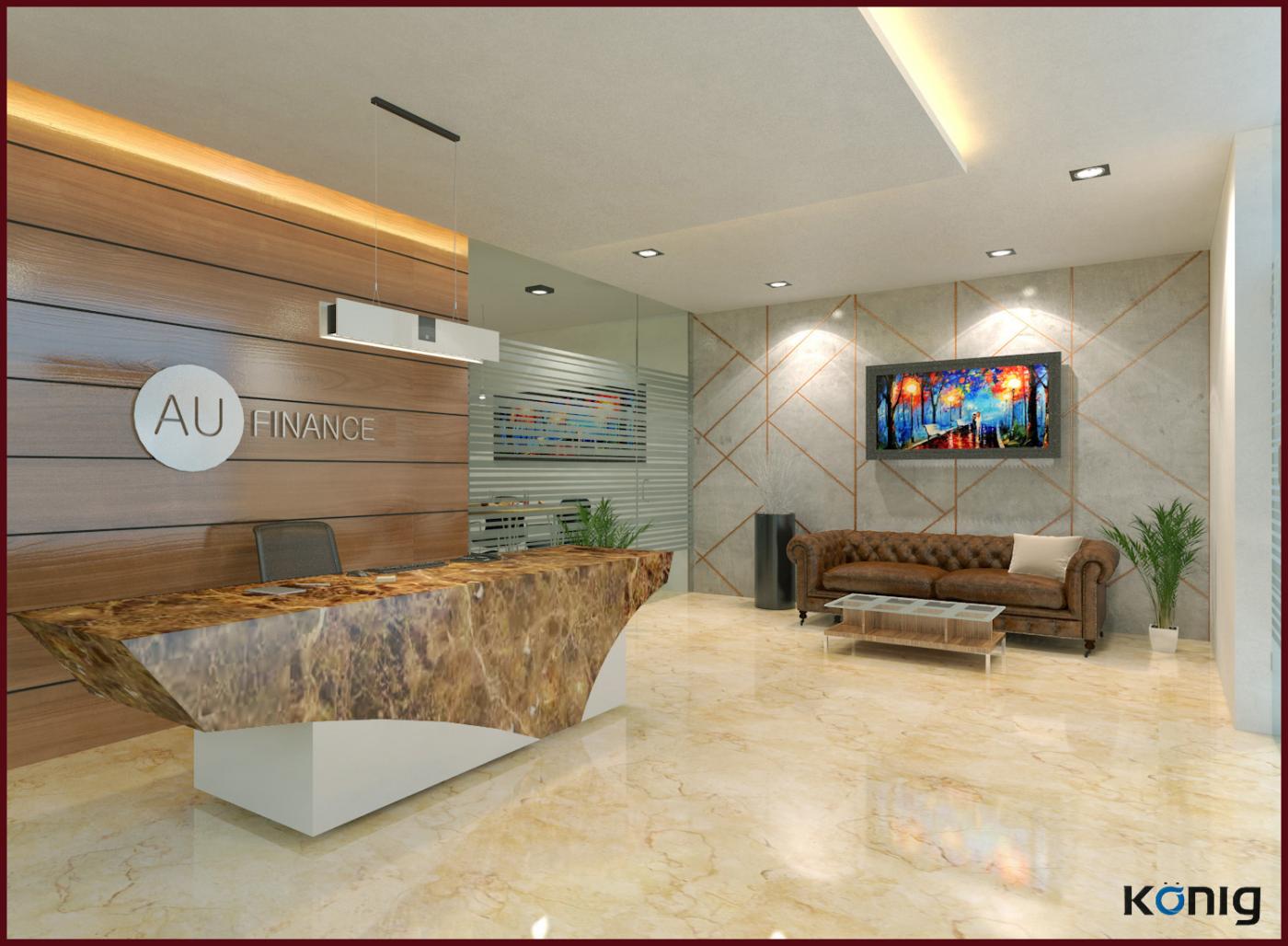 Contemporary workspaces are a result of chronological innovations in office designs that were introduced to create a productive working environment. Banks are typically a stressful space, lacking any design novelty; however these financial institutions have evolved over time, by optimizing real estate fostering higher levels of employee engagement through design. This intention has been integrated into the formulation of commercial office space for AU Bank, North Avenue. Located in Vatika Business Park, Gurugram, the workspace exhibits spirit and technique via clean lines and earthy colour palette. This functional design adapts the defined requirements of accommodating 70 individuals together. Minimal in its approach, the design prioritizes efficiency while being youthful and breezy in its composition. Greeted by a pleasing veneer backdrop highlighting the brand logo, the reception hints of an unfolding experience further. A sleek amalgamation of materials like marble, glass and wood characterize the space, also accentuated by the interplay of light and colour. In the centre, rests an Italian marble table, atop which hangs a chic rose gold led chandelier, illuminating the reception moreover endowing aesthetics. To keep the visitors and employees segregated, meeting rooms have been provided adjacent to reception restricting the entry to the employee work area. The circulation spaces are user-centric in nature as well for comfortable and easy transitions. Moving forward lays the cafeteria; where the brand colours of AU Bank, orange and purple, have been appealingly incorporated. Orange has also been used in furniture and purple in accents on stucco-painted walls, popping out sublimely in the overall scheme of the office. The central open workspace is arranged with various glass cabins on the sidelines with clear visibility across space and engulfs the feeling of spaciousness. The cubical spaces are composed of half-paneled partitions between tables increasing coordination among employees yet with distinct barriers. The focal point of the office is its conference room, constituting a perfect blend of veneered panel and stucco paint on walls, aided by a mix of tiles and carpet for flooring. The office cabins, adjoining the conference room, have beveled mirror walls fused with inspirational quotes from great minds like Albert Einstein and more.