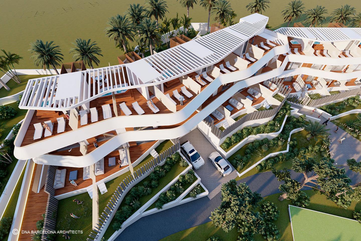 This project located in Calonge – the heart of Costa Brava, was mainly inspired by the waveforms which are already known to be DNA’s indicator. The sinusoidal forms create energetic places allowing to be in touch with the nature and its elements. Connected areas and open spaces encourage and enhance social interaction. The project provides private and public terraces.