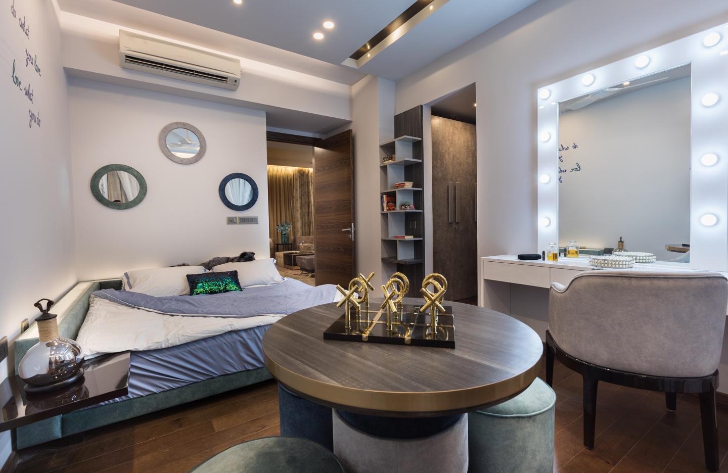 An area of 3070 sq ft in West Phase of M3M Golf Estate is a home that has been consciously designed keeping in mind the lifestyle, likes & dislikes of every family member. The thoughtful designs were made to fit for every individual of this family and their day to day routines. Be it the pastel-themed bedroom for 2 little girls – breaking away from the prejudices of pinks or the custom-made dining table or the sleek study table with some interestingly patterned ceilings in the master bedroom to the lush green stretch in the balconies.