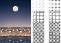 In addition to the dramatic display of light being filtered, the multi-layered architectural system also protects the inhabitants from the intense sunlight and provides a cooling environment. The pattern is generated from simple iterative repetition of geometries which are grafted on the ground level to inform the landscape design consisting of water bodies and soft/hard landscape elements.