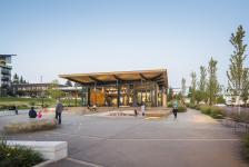 The 4,600-square-foot Hangar and 24,000-square-foot Town Square provide a year-round focal point and a symbolic living room for the city. Located in the heart of downtown, the complex touches upon the primal notions of gathering, creating a venue for passive and active recreation while ensuring a home for nature in the rapidly growing community. The Hanger, conceived as a pavilion, is designed to morph depending upon weather or functional requirements. Simple and large, the space opens to the Town Square via a 24-foot-wide by 16-foot-tall bi-fold window wall. When open, the large roof overhang provides protection from rain and sun, and enables parents easy access to their kids playing in the adjacent 14,000-square-foot plaza. The plaza features a fountain and heated rocks to encourage people to linger in inclement weather. The inverted roof lifts up from the building to gesture toward the park and adjacent thoroughfare, with the residual gap between building and roof becoming a dramatic clerestory. At night, the extensive glazing transforms the shelter into a lantern.