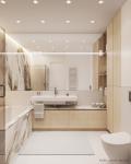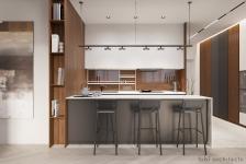 A large closet in the hallway goes into kitchen modules with built-in household equipment, to separate them visually, we used several types of decorations – wooden veneer, graphite with milling and white matte graphite. The kitchen island expands a working area, and also is used as an additional table, for breakfasts, for example. Above it is the Estiluz Button luminaire, whose graphic character is portrayed in front of white facades.