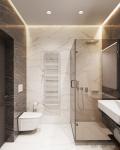 In the parents’ bedroom, the main accent is marbled tiles with a warm large pattern, cut into strips of different widths, it also goes into the bathroom. A chic Minotti Lawrence bed with a large headboard occupies almost the entire width of the room. In the bathroom and bath and shower, as well as many storage spaces – wardrobes with laundry baskets and a large cabinet under the sink.