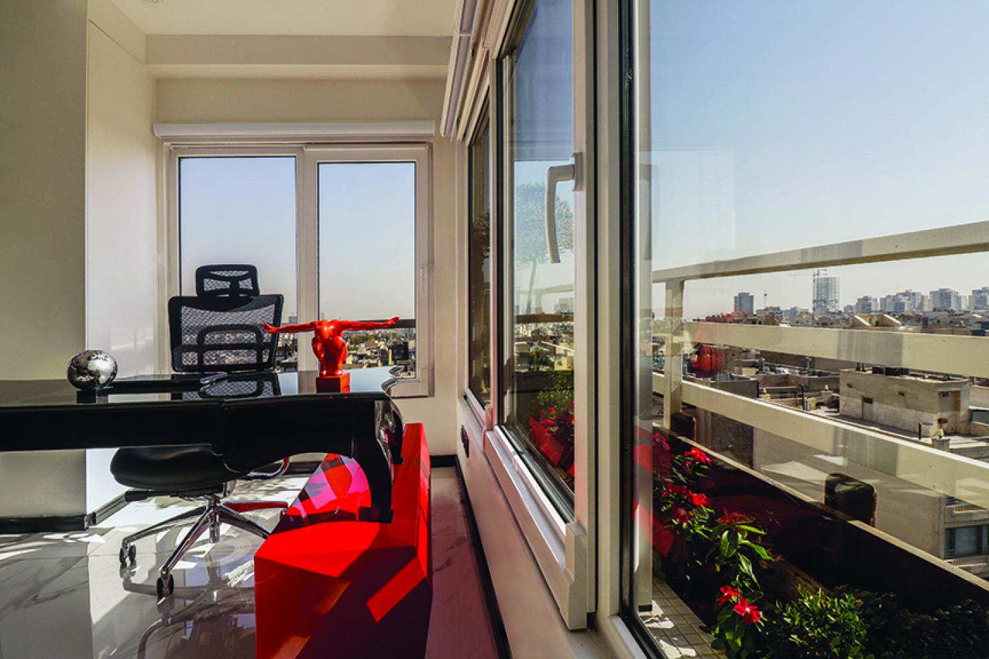 Where ever in the studio is shiny and white not only because of the intelligent choice of material including high glass surfaces and white marble stone but also a glass partition which divide the studio into two main spaces, although transparency and sunlight flow throughout, the space is kept.