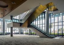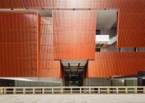 Building colours are carefully selected to provide a hint of traditional Chinese architecture but still appear modern. The base colour is in neutral grey tones with off-form concrete for all exposed structural elements. Dashes of gold are injected into curtain wall capping, escalator soffit, and ceiling grid. The colour red is used in the auditorium ‘red-box’ and the forest of Lagerstroemia floribunda ‘red leaf’ at the roof garden. The roof garden is a contemporary twist of the classical Chinese garden, allowing the roofscape to stand out as a memorable focal point within the city, when viewed from surrounding high-rise developments.
