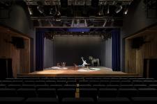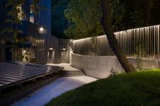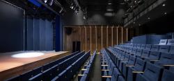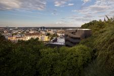All massive technical features inherent to a theatre are placed within the retracted volume clad with titan-zinc. The building merges with the green hill rising behind it. The voids on either side of the theatre are part of the entire entertainment scenario, which is at the disposal of the guests.
