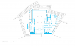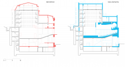 The construction of Teatr na Podoli started back in the 90s and has remained abandoned ever since until recent private initiative has come into play. The newly-proposed renovation project suggests considerable changes to the previous building. Its functional character has undergone significant transformations as the theater has evolved from an exclusive “palace” into an inclusive public space. Almost the whole layout scheme has been altered, together with most of the levels, which has greatly simplified the interaction between the theatre itself, its guests and the city. The fly loft and the stage are the only volumes that have remained intact. The new façade made of recycled bricks recovers the lost parceling and the volume within the overall scale of the street.