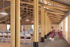 The studio chose to design the community center with solid, rammed-earth perimeter walls to protect against projectiles during hurricanes and a flexible but powerful bamboo roof truss system to resist seismic and wind loads. The form of the building is simple and arose from a desire to create a welcoming atmosphere. Unlike many of the imported, and consequently expensive, materials used in Haitian buildings, earth and bamboo are locally available.