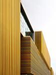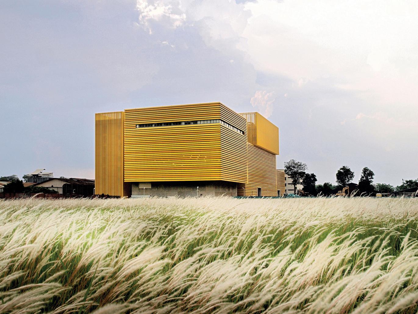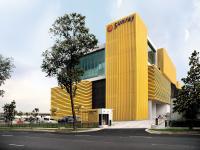 The workers’ dormitory at the rear of the site is clad in vertical louvres with checkerboard openings to allow for maximum natural ventilation while maintaining privacy. Smaller areas which require highly controlled ventilation systems, such as the spray booth and laser cutter work areas, are located within boxes clad in precast concrete with high level windows and mechanical ventilation. The use of yellow throughout the building pays homage to the company’s corporate colour, with the three tones serving as a creative interpretation of the stacked boxes concept.