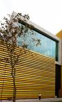 Office spaces are clad in closely spaced vertical aluminium louvres, shading the interior spaces and maintaining a view of the outside. The showroom box is clad in concrete – a contrast to the yellow boxes that make up the rest of the building. Its large picture window further highlights the furniture on display and creates a focal point on two sides of the building facing the train tracks.