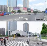 The original site traffic is dominated by cars. Firstly, an entrance square is added at the corner to improve the accessibility of pedestrian space and to provide humanized landscape leisure facilities. Also, a ribbon winding method is used to systematically solve the awning facilities problem, building a gray space, and highlighting the identity of the main entrance.