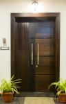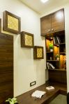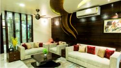 The entrance and the main door is modern yet ethnic, “Long metallic handles on dark veneered double panel door provoke an emotion of welcoming. Drawing room ceiling is a mixture of various metallic materials, which is the signature style of designer kirti, beautifully blended in curves which further continue on the wall with wooden paneling, illustrating that, “Curve is a new Straight.”