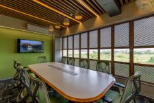 When it comes to entering the space it is further segregated in different areas according to its functions like Reception, Conference room, Director’s cabin and work stations. The reception area is kept subtle with concrete finish on the wall, complimenting the grey tiles on the floor and infusion of green colour on the reception desk stands out to keep it more natural overall creating a soothing environment. The baffle ceiling with profile lights in between is moreover the eye catching element of the entire space giving it a raw and natural look. maintaining the theme
