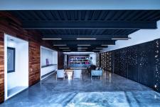 The architects started from a three sections plan to create a central axis where all the social areas of the house: office, dinning and family room, were located. The bedrooms and services are on every side of this section. With this approach the visitor enters through a completely open broad rectangular atrium with the slab left apparent, a grand floated and perforated lattice is the central feature and when sliding the panels the kitchen is unveiled.