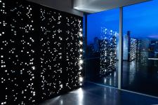 The office area is an island enhanced by the white plafond and semi open bookcase that gives some privacy to the desk, inside a sober palette where color black stands out and the grey stone is contrasted by the wood covering the wall hiding the bedrooms doors.