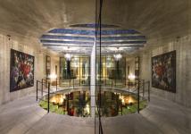 Inside the house there are no enclosures or changes in levels, and the private and service spaces are limited using reflective glass walls in such a way that they can be seen from the inside to the outside and from the outside we only perceive the reflections. Like a kaleidoscope, a series of mirrors strategically located inside a tube create an optical illusion; these walls help create an infinite set of reflections that vary throughout the day thanks to the light and shadows provided by the semicircular perforation located in the interior garden and the sculptural staircase to access the private area.