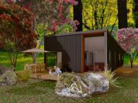 With the selected panel construction modular that only use selected particleboard thickness for materials: 36mm thick, fine surface for wall panel, 25mm thick, fine surface for ceiling and 18mm thick, fine surface for lining. Everything is pre-cut to size with grooves and rebates for easy assembly.