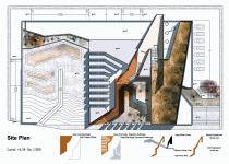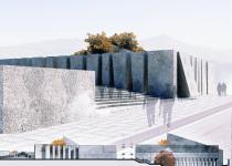 Firstly, user is encountered with a solid form which seems mysterious and tend to attract rather than invite users. In the first steps, users will be involved in finding the entrance. Several entry routes tend to confuse users and memorize the early hours of the bombardment where people couldn’t find their ways, their darlings and didn’t know what to do. Once user enters, drowned bodies as death metaphor will revive what has happened. In the midway in-site lonely tree will talk about today's victims, their hard breathing and other continuous sufferings. In-site tree's location is a pivotal point where different directions have different meanings. Turning right, there is dead-end glass-way to children playground. Disability of hearing and accessing children will talk about victims' disability of breeding healthy children, due to genetic problems caused by chemical weapons. Straight upward direction, takes users to the green roof, where an overview of the city and its pure nature inspire a promising future for the next generation.