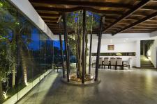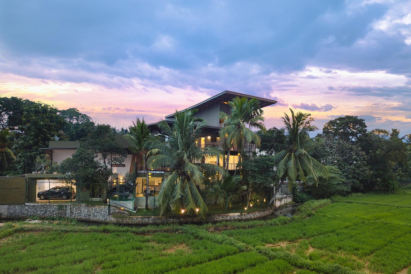 The primary objective was to hide the property from a blind spine wall & open out all most all the spaces towards paddy fields to create glimpses, vistas & complete openness during the journey through the spaces inside. All most all the trees were there along the periphery of the paddy field, where the unique “Jambu Tree” in the middle & all were protected without axing down a single tree. Architect’s attempt was to arrange this house around this tree by creating a moving emphatic, elemental square canopy roof over this “Jambu Tree” & articulated spaces from the blind wall with simple roof forms to generate the form in different 3 levels. Single pitch top most roof to cover the lockable bed room areas, placing completely open Visitor’s bed room on the top. Rest of the living spaces were orientated around the “Jambu Tree” in strategically elevated ground & first floor levels to place predominantly open plain dining and living at ground floor & timber floated first floor living space under this elemental moving roof structure at medial level & see through polycarbonate sheet roof at the lowest level to cover up the entrance path leads to the leaner main entry corridor opens to the paddy fields by making glimpses.