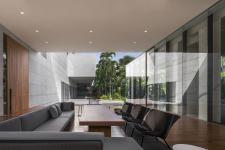 Located in the fluctuating skyline near the suburban area of Bangkok, this three-story dwelling is constructed and substitutes some parts of the old house that are situated among the existing surroundings of a swimming pool, pool deck, the guest house and the preserved big scale of palm trees.