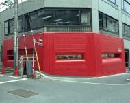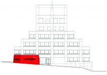 Differing from its surroundings by the absence of a front window display, this UFO takes its inspiration from the tight volumes of military bunkers, with thick slanted walls, gun ports and baffles inside. In this project, the issues are considered the other way around, the red concrete façade acts as a landmark, a point of reference on the scale of the whole city and it can be seen from a great distance.