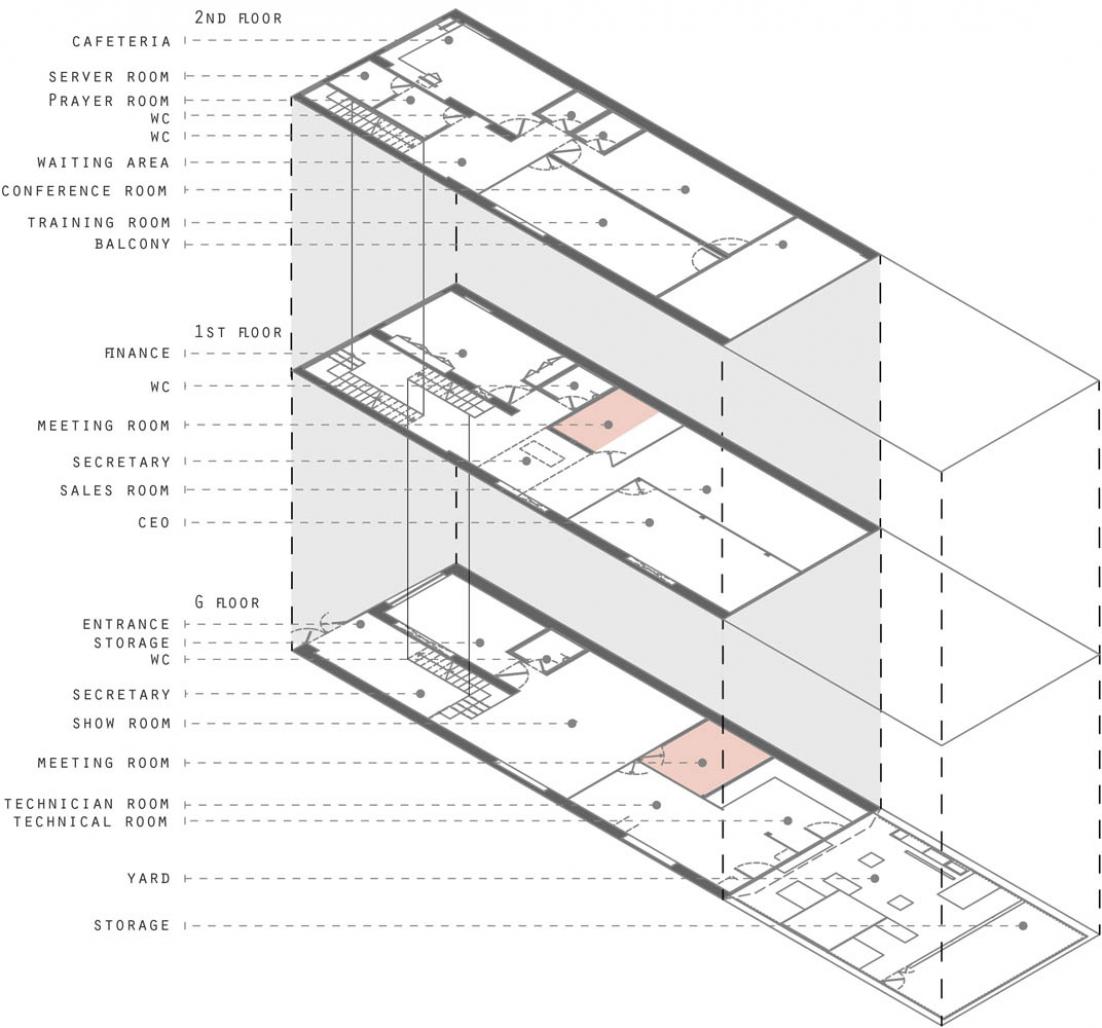 In the first stage, spaces were designed based on the access hierarchy and the requirements of each space. After the formation of the basic scheme of spatial relationships, floor plans were established to fit the physical program of the project, including a showroom, service and after sales services, sales departments, training halls, conference room, etc.