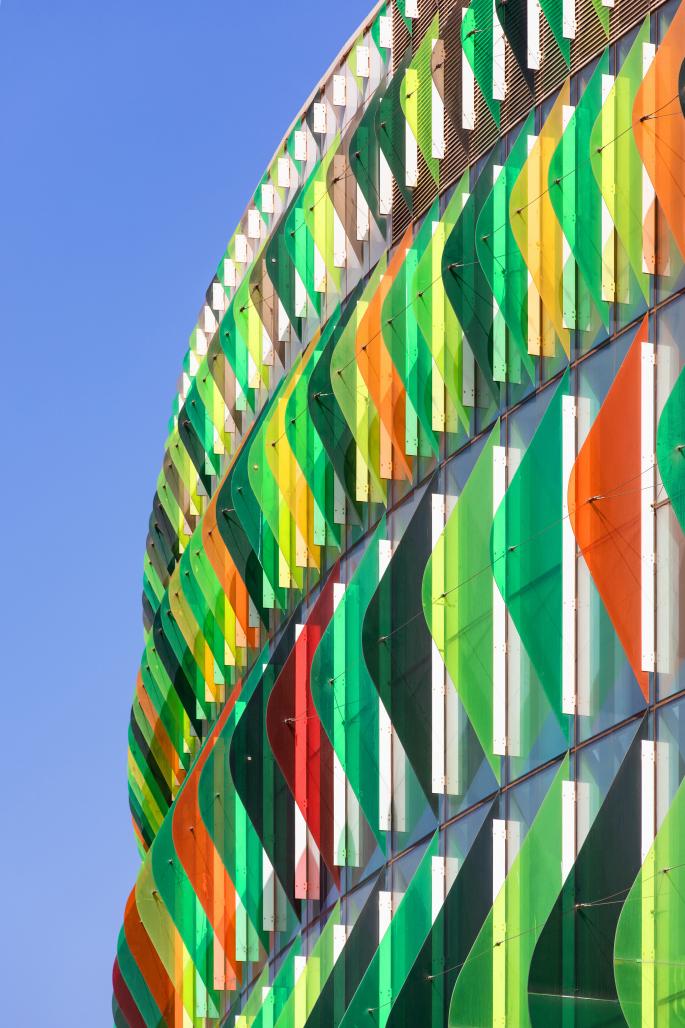 The rich and colorful local culture is the main inspiration of the design of the Arena. Many prominent aspects of African culture, including fashion, handicraft, work of art and traditional local dwellings with their unique motifs, patterns, use of colors give the main identity to the building. All these aspects are combined and reflected in the materiality of the architecture of the building. Variety of locally inspired colors and patterns standout in the facade. The selected colors derive from the flag of Senegal and they follow a rhythm while functioning as sunshades. While the colors are irregularly placed horizontally, their sizes decrease vertically towards the roof. This organization brings dynamism to the facade. With the elliptical shape of the building and the perpendicular placement of these elements, the facade gives different levels of transparency from different angles. The particular shape of the sunshades is inspired from the local leafs. These sunshades are used in order to create stratification in the plan. They mark the border between the exterior podium and internal circulation of the spectators. On the other hand, foyer back wall is characterized by a white clean surface. Reflections of the colorful leaves on the facade shine upon the white walls of the main circulation area, giving color to the space and signaling the motion of the sun throughout the day. The colored shadows regularly change their direction and bring forward a sort of dynamism to all of the surfaces to make the impact of the nature visible and playful. The color works as a catalyst, enhancing the integrity of the volume and building the overall idea. The visual movement of the facade turns color into a performance element.