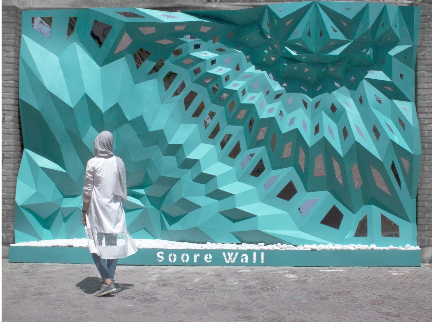 Soore Wall is the novel result of an architectural study. The wall had been built by recreating muqarnas art with an approach to algorithmic design and digital fabrication. To form the general structure of the wall we used the evolutional algorithms for developing rosette geometrics and gere chini. Also the wall has been decorated with mirrors which were designed with attractive algorithms to strengthen the students interactions with the the wall. The functional goal of the project was to vitalize an old and forgotten wall to become a place for students communications and a space for performing the university's events at the same time.