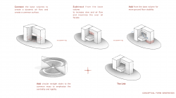The location was chosen based on the Center of Gravity method, and the building itself is acting as an Interactive Connector that is joining the detached parts of the community together, by celebrating the differences between the community to reach the state of harmony within a dynamic atmosphere. Which is reflected back on the mass generation story, starting from the rigid basic form which reflects the community now, and applying the subtraction process to add the dynamism to the mass.
