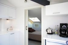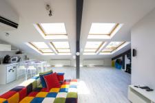 Eighteen roof windows were placed in the main room. One was placed in the bathroom and one in the sleeping section. Shutter and roller blinds were added to each window. The roof slope makes the roofs adorable and at the same time design with that slope is difficult. Difficulties arise in the use of the lower parts resulting from the slope. However, these areas, which are very low, should not be seen as unnecessary and should not be covered with walls because they add value to the space in volume. Height can be added to the room by using roof windows extending to low parts.