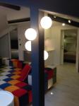 For night illumination, instead of general lighting, architects were used directional spotlights, ground-lit spot lighting, sconce and hidden led lighting, thus creating a dramatic lighting. In the center of the space, they designed a large 350 cm armchair and an open space around the cinema system with an open kitchennette and dining, study corner and fitness corner. The bathroom area was separated by glass and blinds hat was also used for the main cinema system.